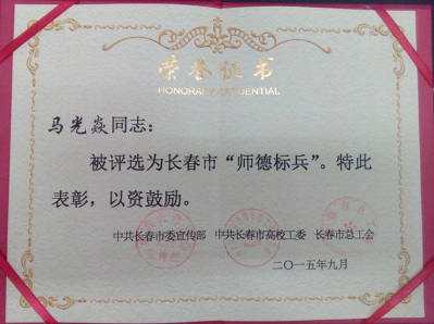 近日,长春市委宣传部、市高校工委、市总工会等7家单位联合下发《关于表彰长春市教科文卫体系统职业道德标兵的决定》。经基层推荐、组织把关、严格考核和社会公示,共评选表彰师德标兵59名。公司马光焱获长春市“师德标兵”荣誉称号。