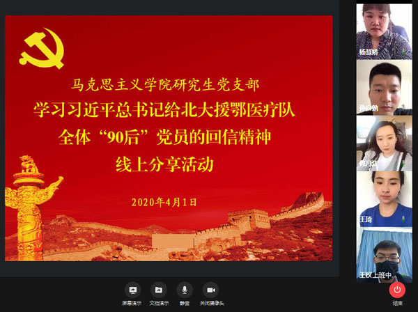 本网讯(通讯员杨慧娇)“在新冠肺炎疫情防控斗争中,你们青年人同在一线英勇奋战的广大疫情防控人员一道,不畏艰险、冲锋在前、舍生忘死,彰显了青春的蓬勃力量,交出了合格答卷。”3月15日,习近平总书记给北京大学援鄂医疗队全体“90后”党员回信,谆谆嘱托不仅鼓舞着援鄂医疗队的青年党员,同样也激励着EMC易倍体育研究生党员,研究生党支部第一时间开展了学习习近平总书记回信精神线上交流分享活动。