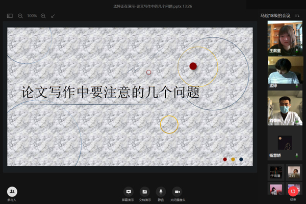 思想政治教育专业岳子琪同学认为,平时的学习、积累与实践是完成一篇高质量论文的基础,只有读书、动笔,才能使能力得到逐步提升;要培养问题意识,写论文要沉下心、真思考、多沟通、虚心请教,同时要有吃苦精神,前期的文献评述和框架整理环节是非常消耗精力的,后期论文的反复修改和“打磨”也是自我修炼的过程,多一分耕耘,必定多一分收获。陈美含同学表示通过老师的讲解,对论文写作方法、内容、格式等有了更专业的认识,启发了论文写作灵感。正像孟老师所讲“写论文是件身体力行的事情,要不断对论文进行‘冷热’处理,不断修改、探索。”马克思主义基本原理专业杨慧娇同学表示,撰写学术论文不仅是个“系统工程”,更是一项身体力行的事情。孟老师通过“云传递”的讲授方式,为同学们系统梳理了论文写作的过程与技巧,“9个常见问题”为论文的创新搭建了“灵魂点”。